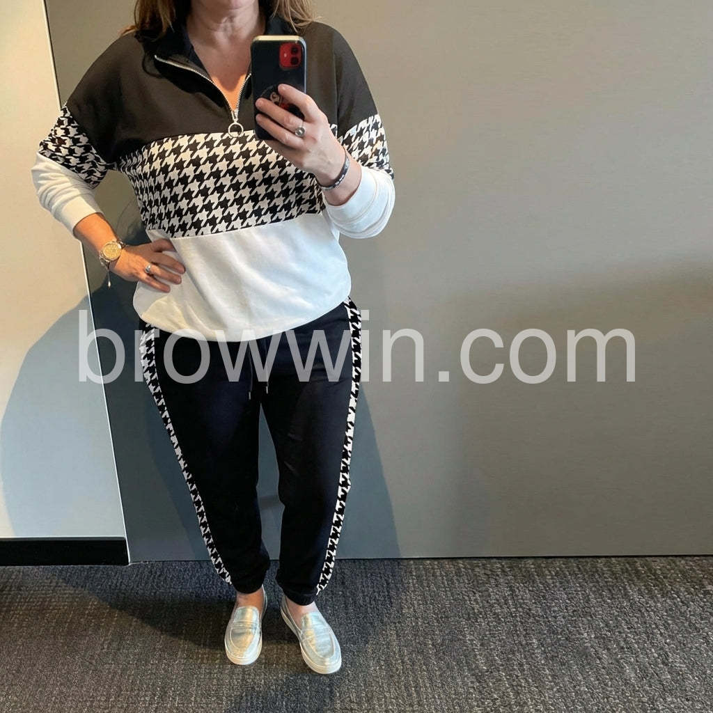 Unique Houndstooth Print Long Sleeve Two Piece Set