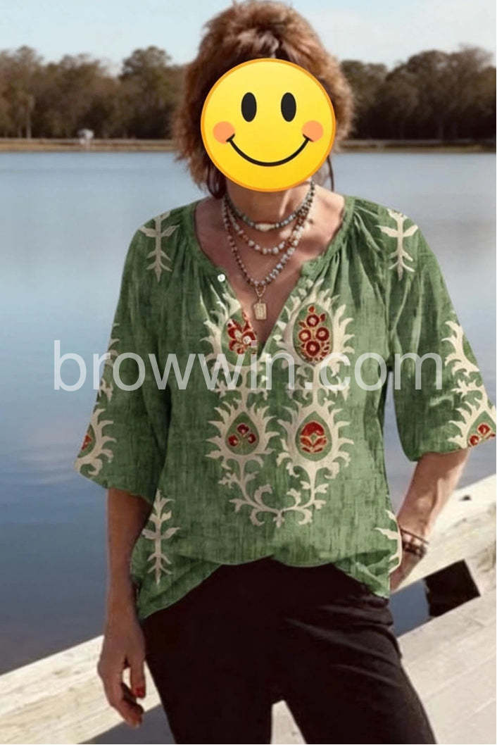 The eye-catching feature is the intricate, symmetrical bohemian-inspired print that adorns the front and sleeves, featuring a harmonious blend of cream, red, and brown tones against a rich green backdrop. The deep V-neckline adds a touch of allure, while the partial button-down front allows for adjustable styling. The short, loose-fitting sleeves and relaxed overall silhouette ensure maximum comfort and a flattering drape on any body type.