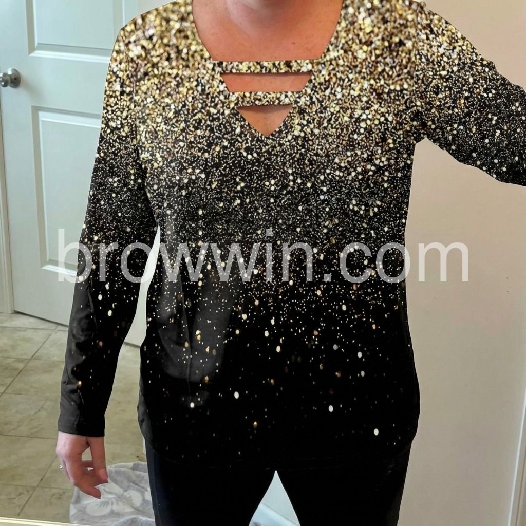 Just in time for your next glam holiday vacay! This sultry, strappy caged shirt has a v-neckline that awaits your favorite layering necklaces or statement jewels. This unique long-sleeved top sparkles with a generous sprinkle of metallic ombre silver and gold print, perfect for pairing with jeans or black slacks, boots, and metallic heels. Machine wash cold tumble dry low to medium heat. Iron if needed or lay flat to dry.