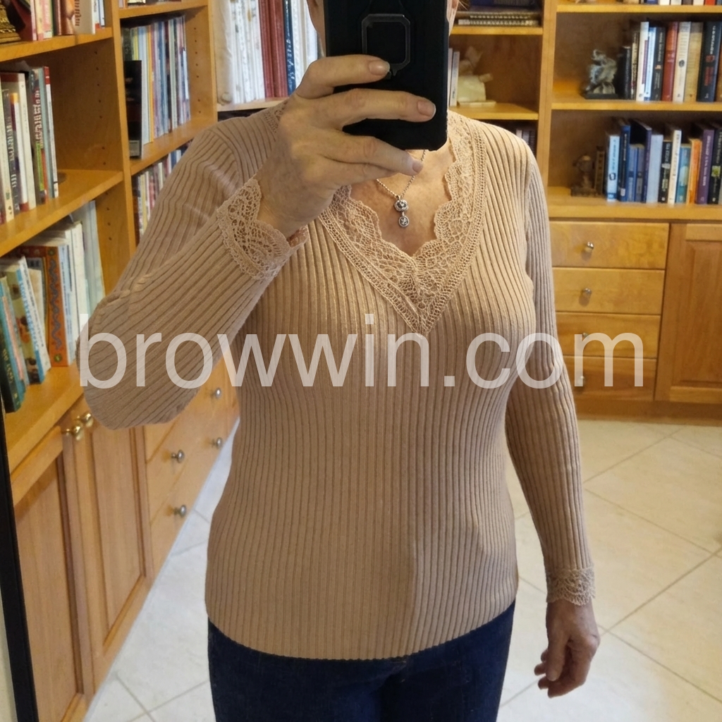 Elegant Lace Trimmed Ribbed Knit Top In Soft Brown