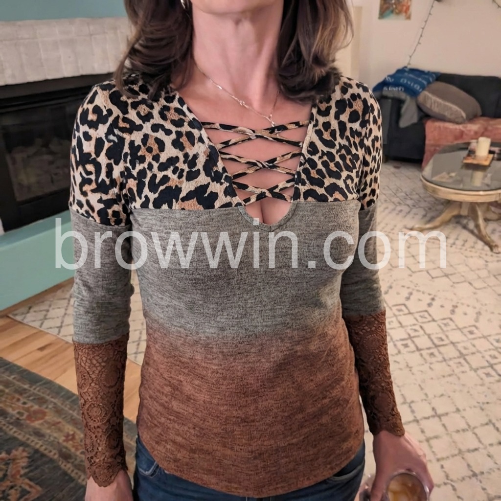 This fitted long-sleeved top features a round rust-colored paisley print, giving it a relaxed vibe. A sultry leopard print and tan color block stripe add versatility to this chic caged strappy v-neck top, making it easy to pair with slacks, a skirt, shorts, denim, boots, or sneakers, a jacket for a night out shooting pool, a date, or anything else. Machine wash cold tumble dry low to medium heat. Iron if needed or lay flat to dry.